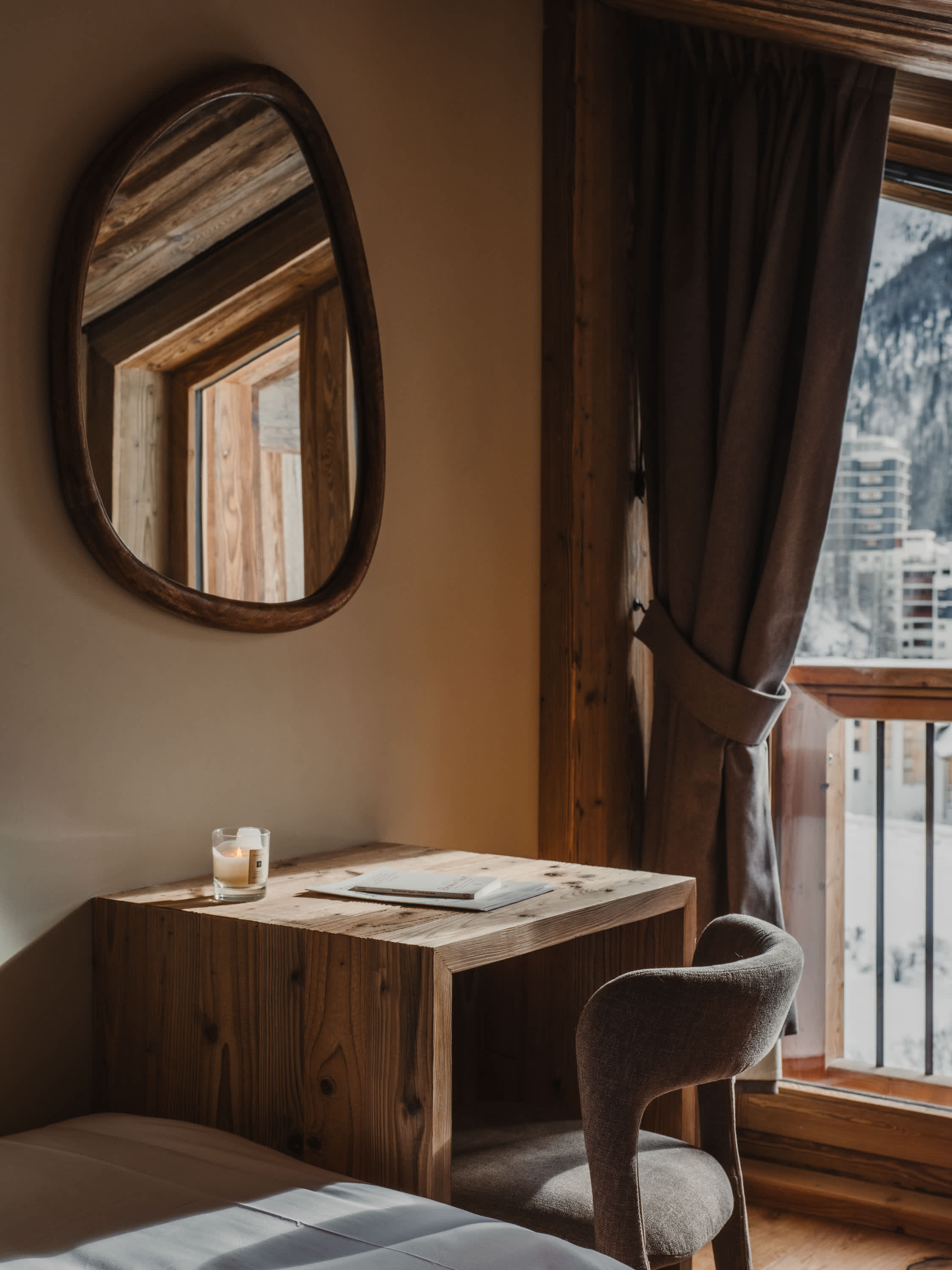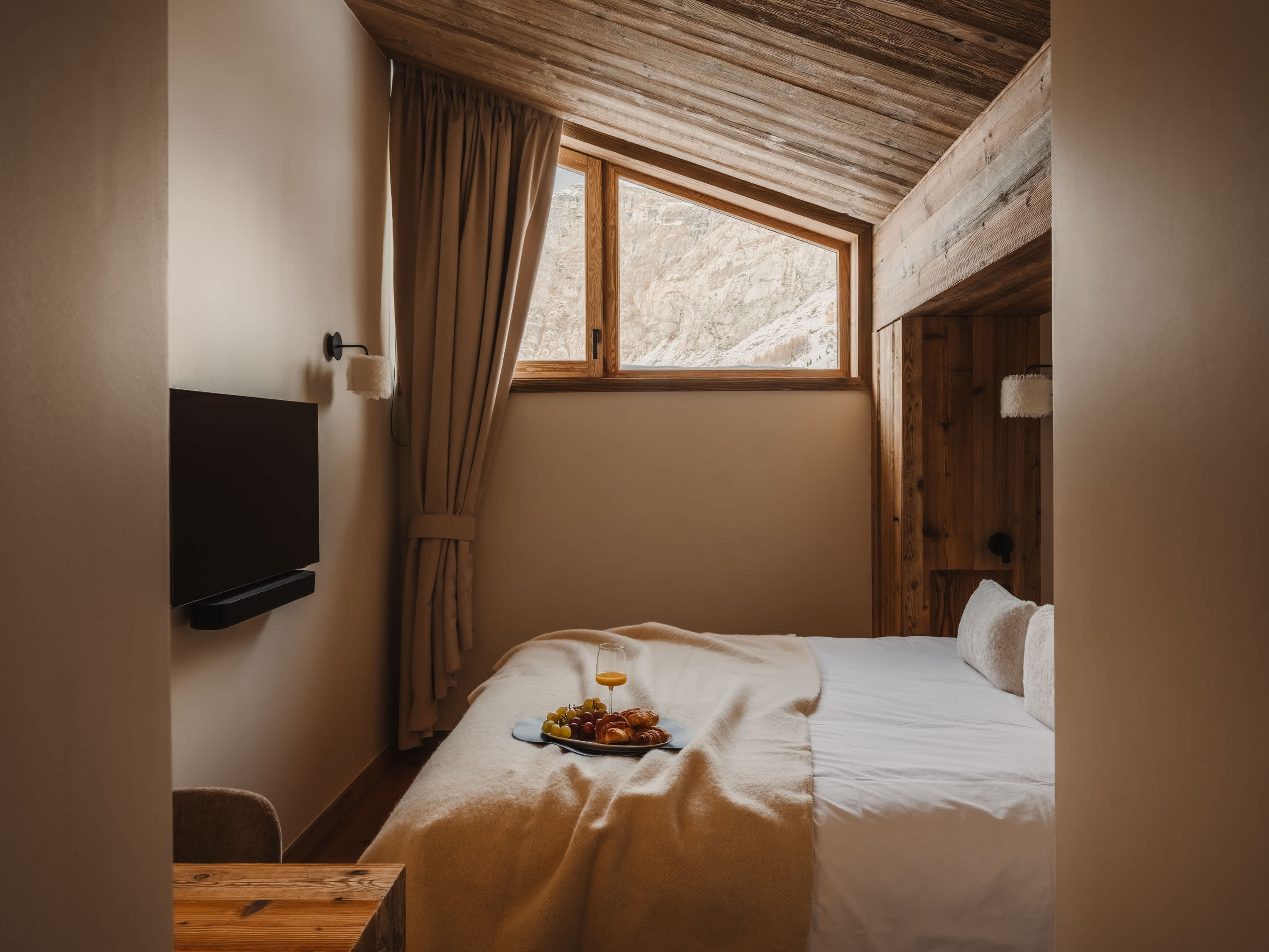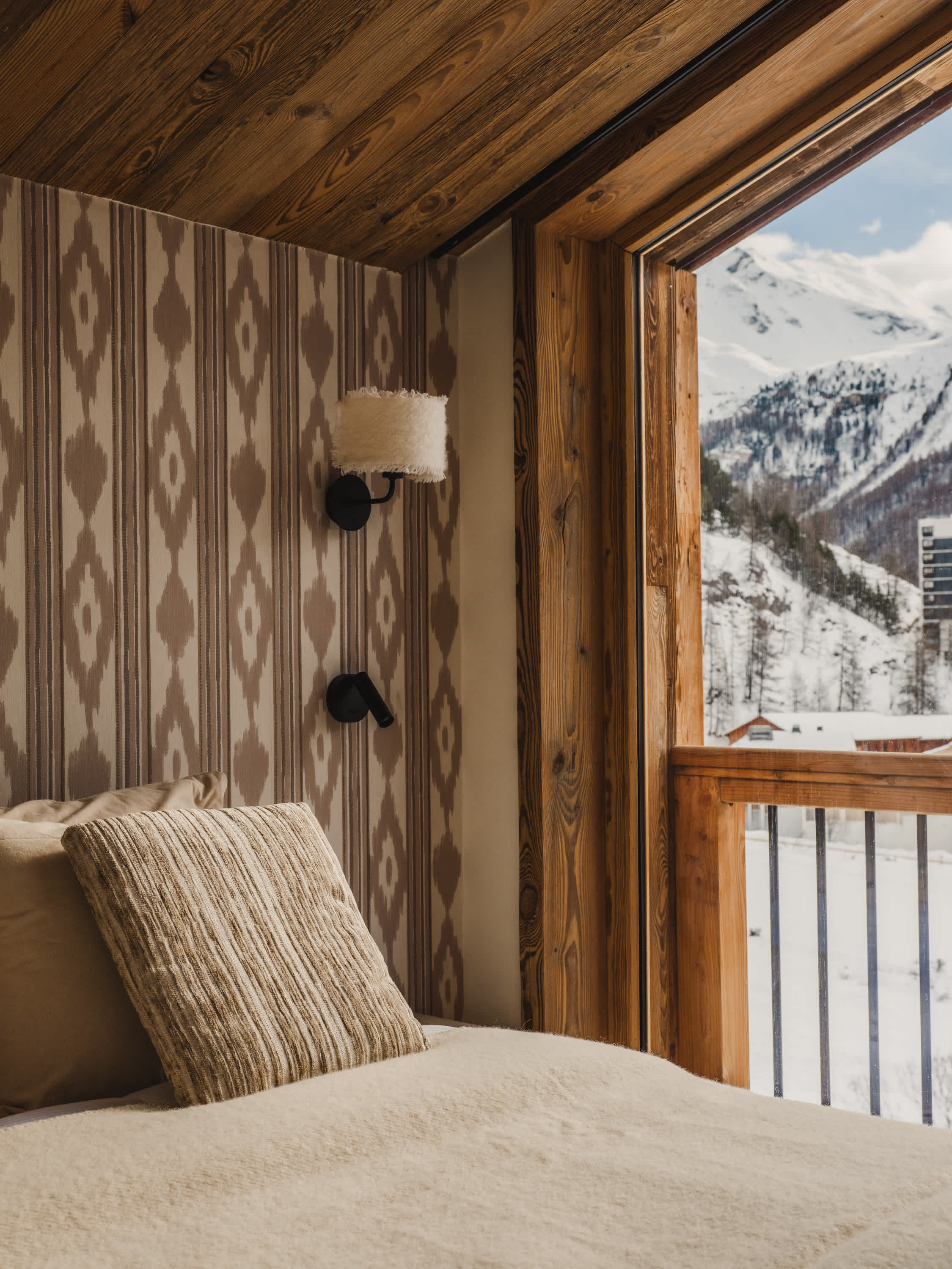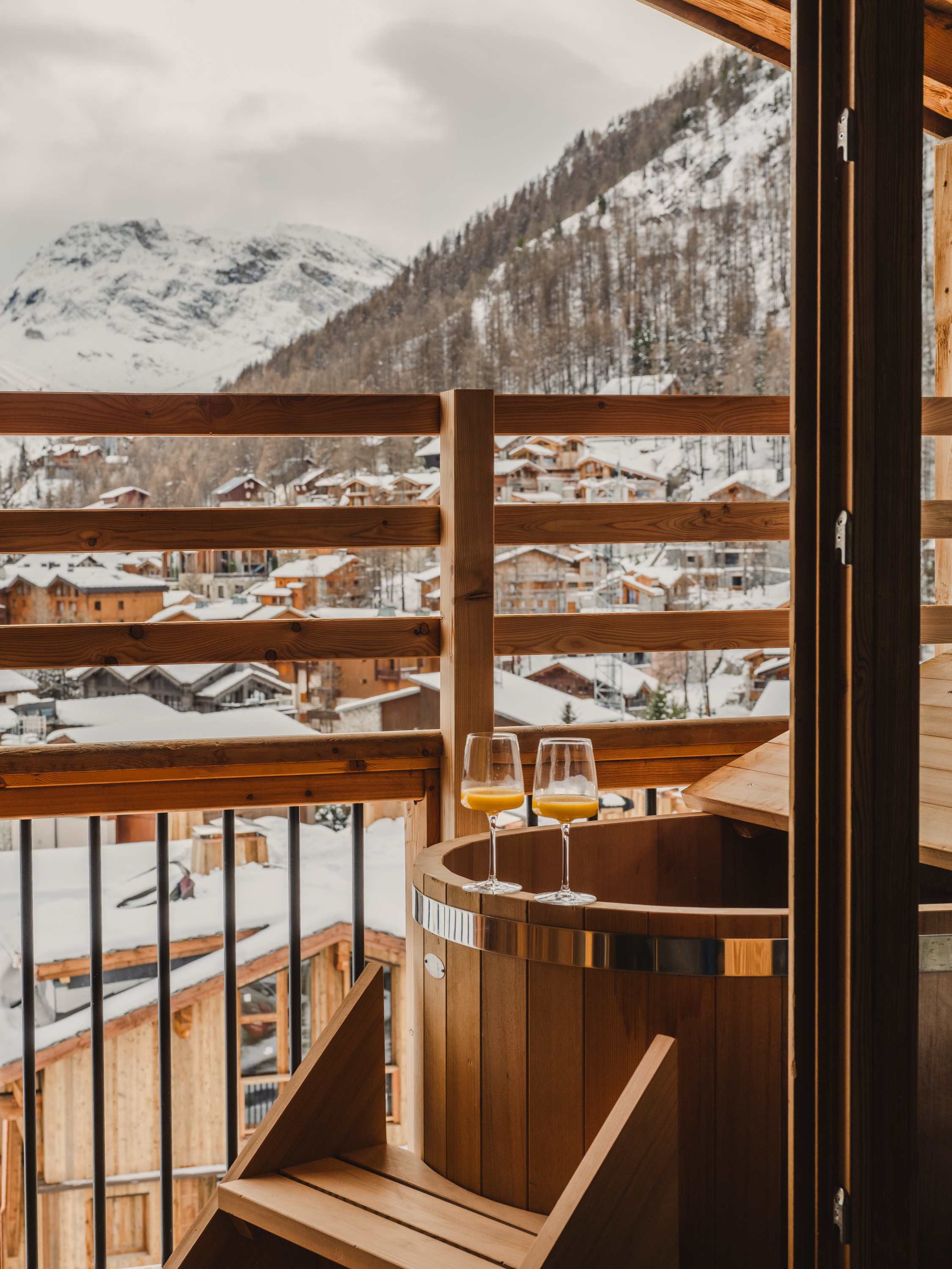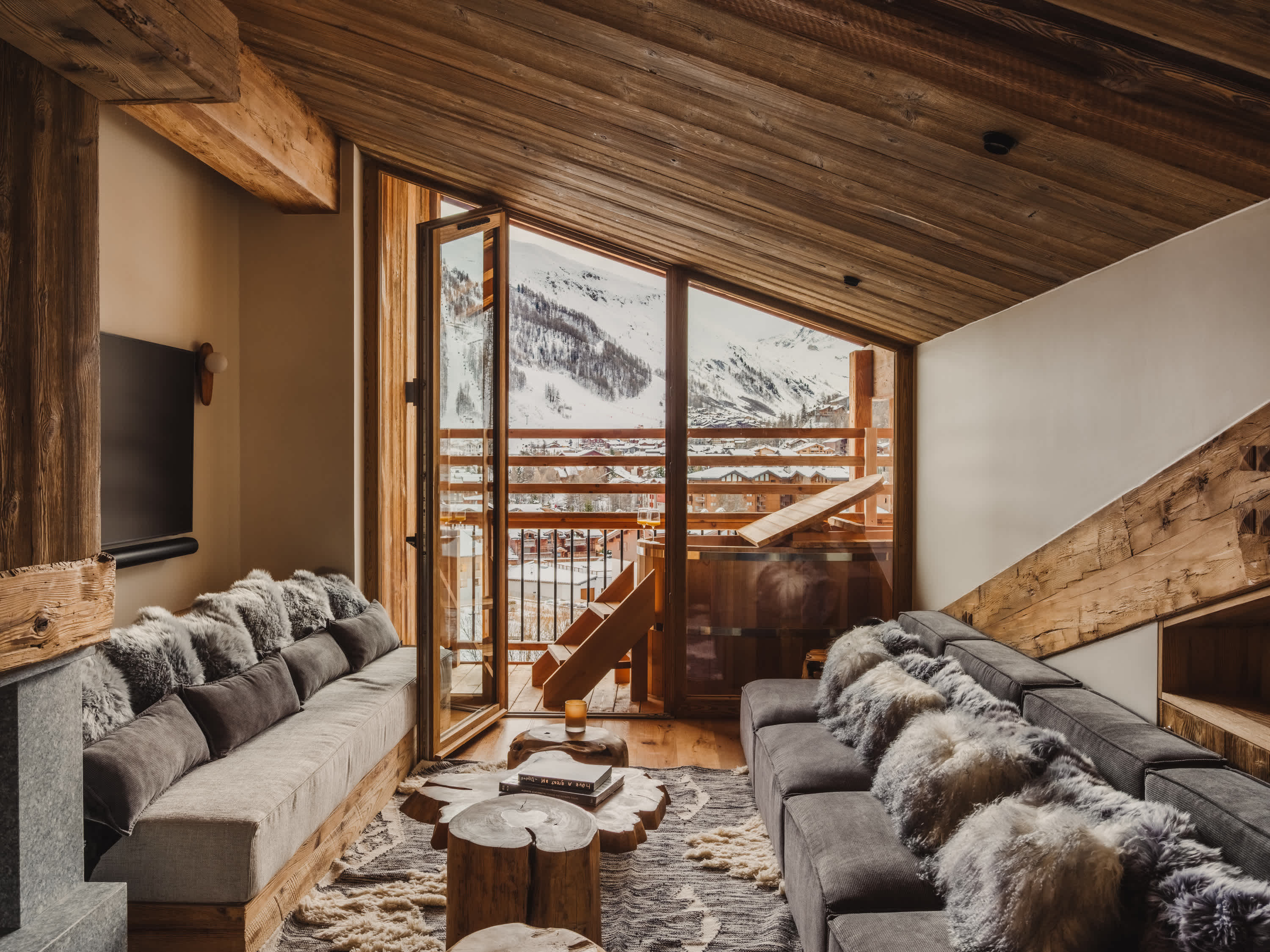 The living area is the heart of the apartment, featuring a cosy fireplace, generous seating and striking wooden architecture throughout. Large windows and doors open onto the balcony, flooding the space with natural light and framing beautiful views over the village and surrounding mountains. Outside, the balcony offers a unique place to relax, complete with a wooden soaking tub — perfect for unwinding while taking in the alpine scenery.