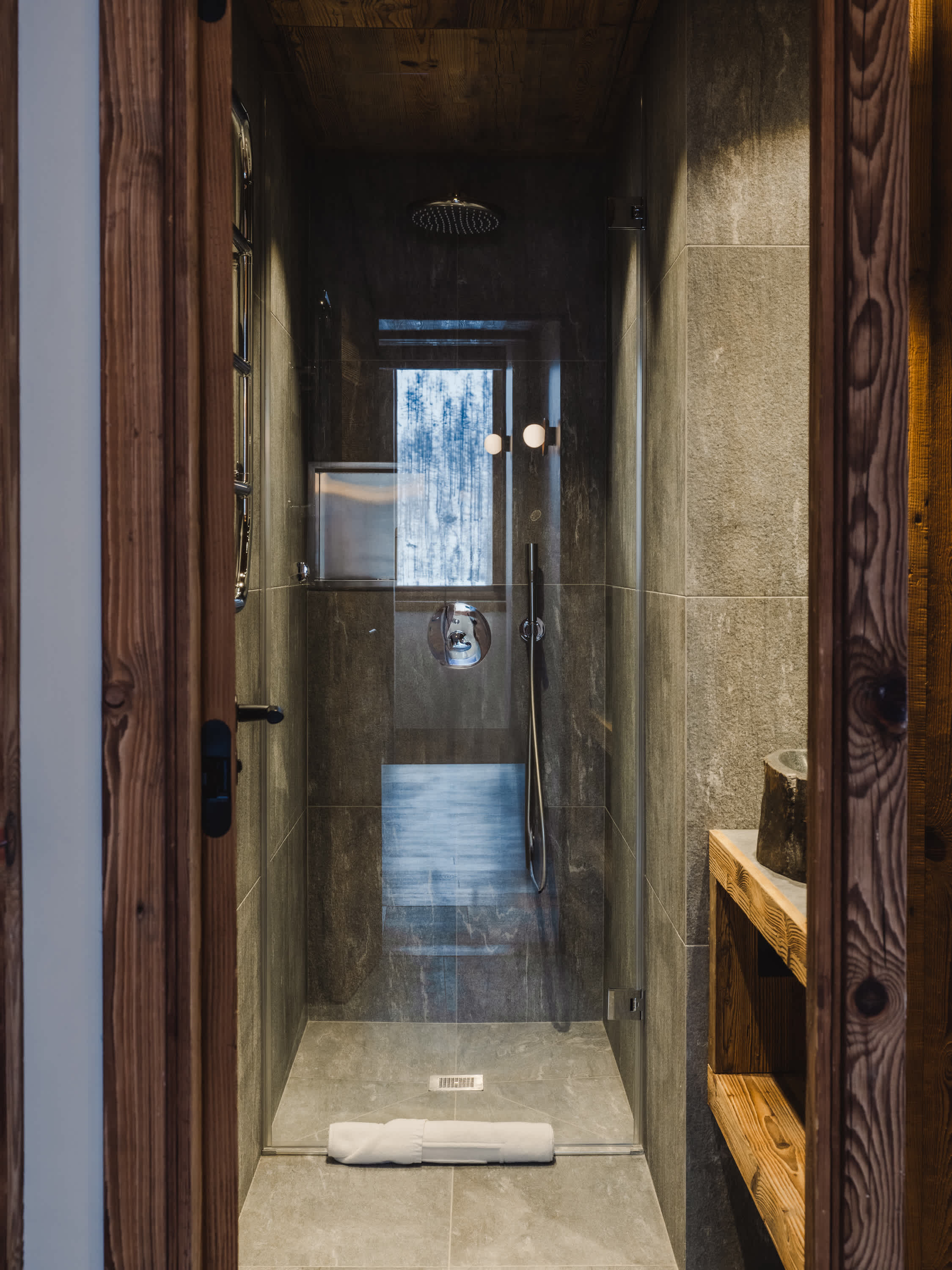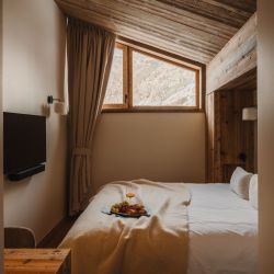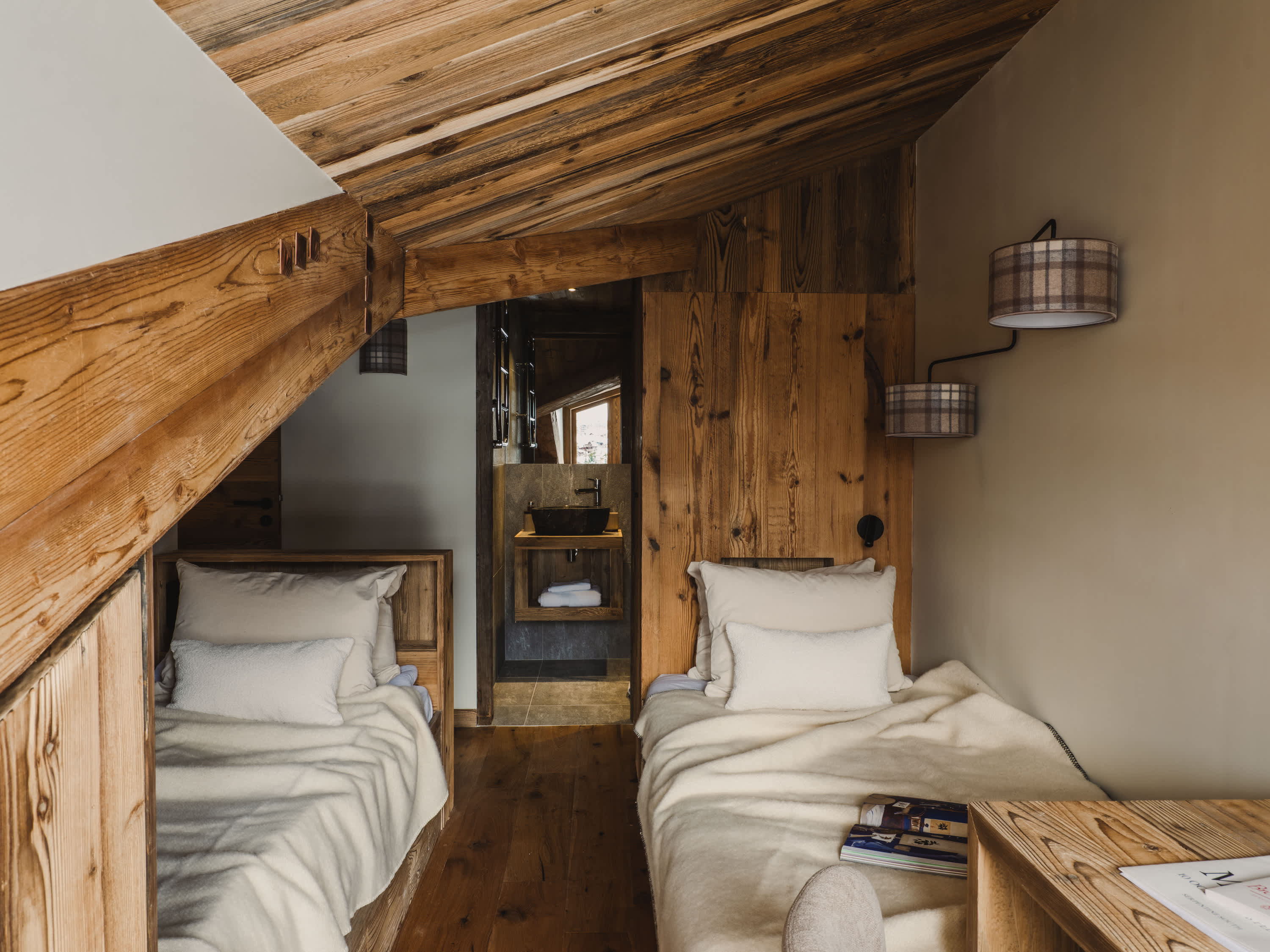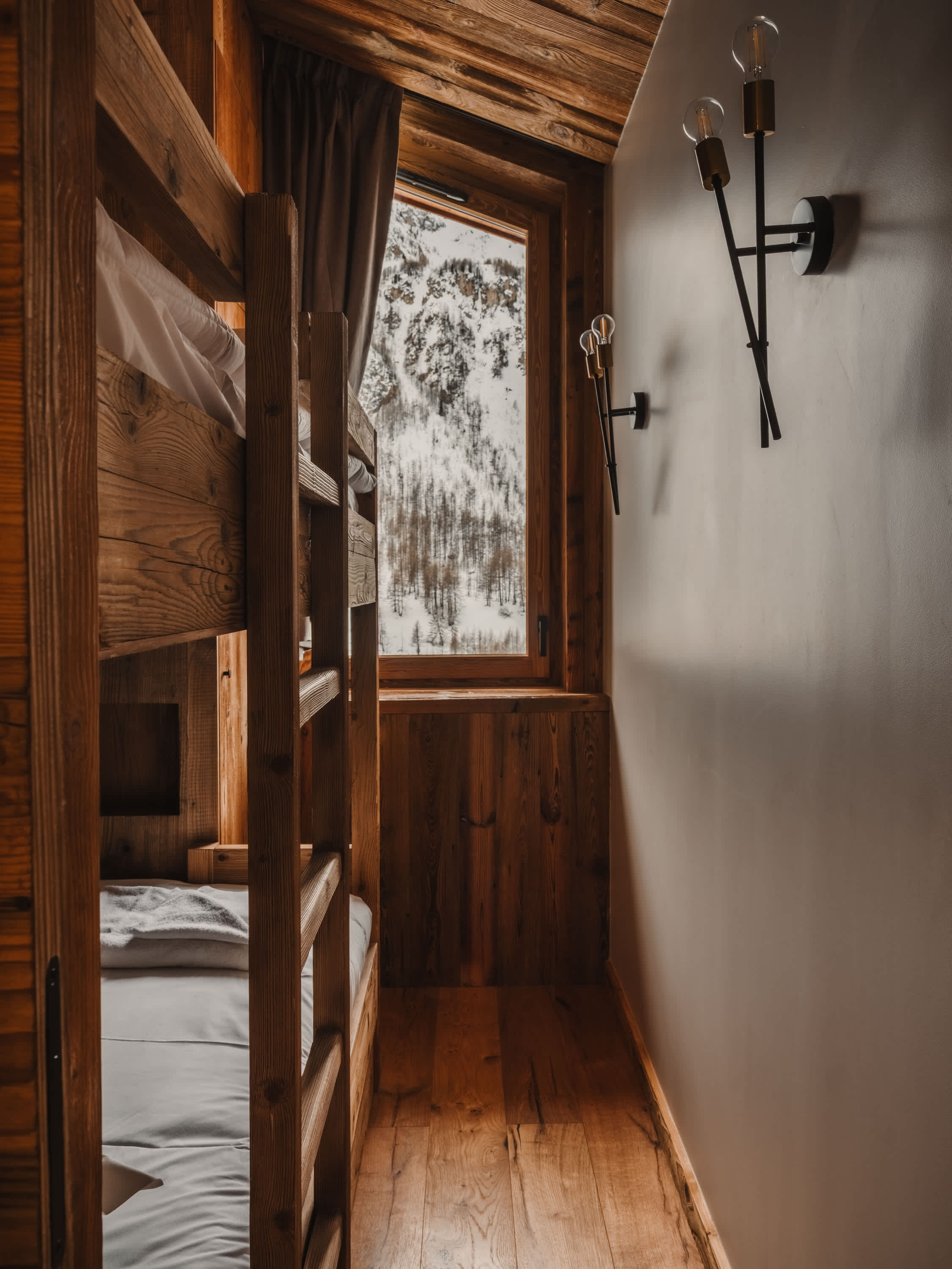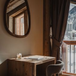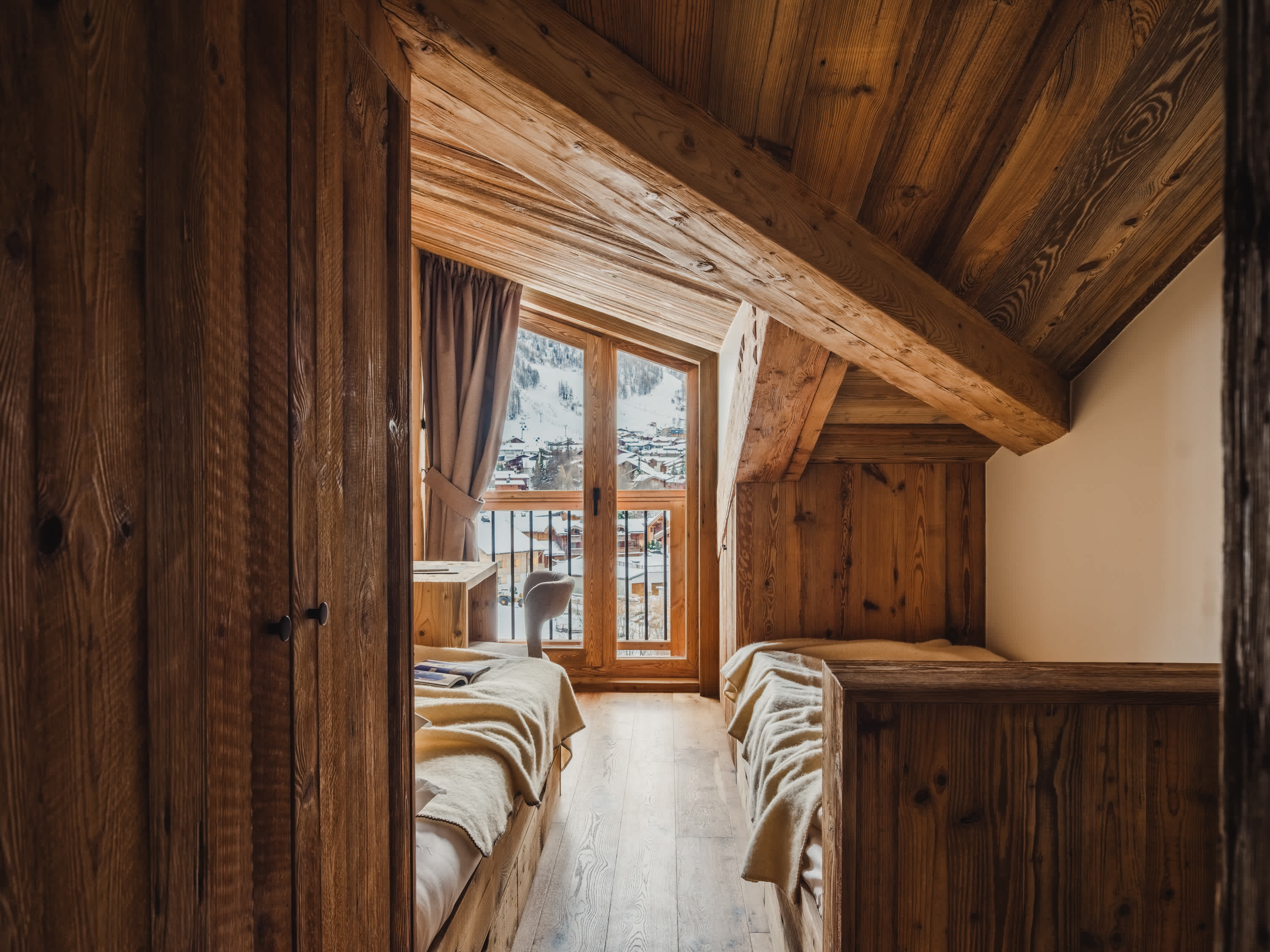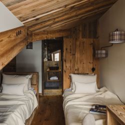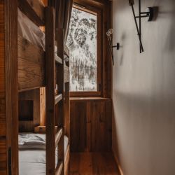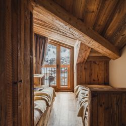 The five bedrooms are thoughtfully designed, each finished in a calm, cosy alpine style with bespoke wooden details and soft furnishings. Several rooms enjoy direct access to the balcony and village views, while a dedicated bunk room makes the apartment particularly well suited to families. The four modern bathrooms, all fully renovated, feature walk-in showers with elegant stone and wood finishes.