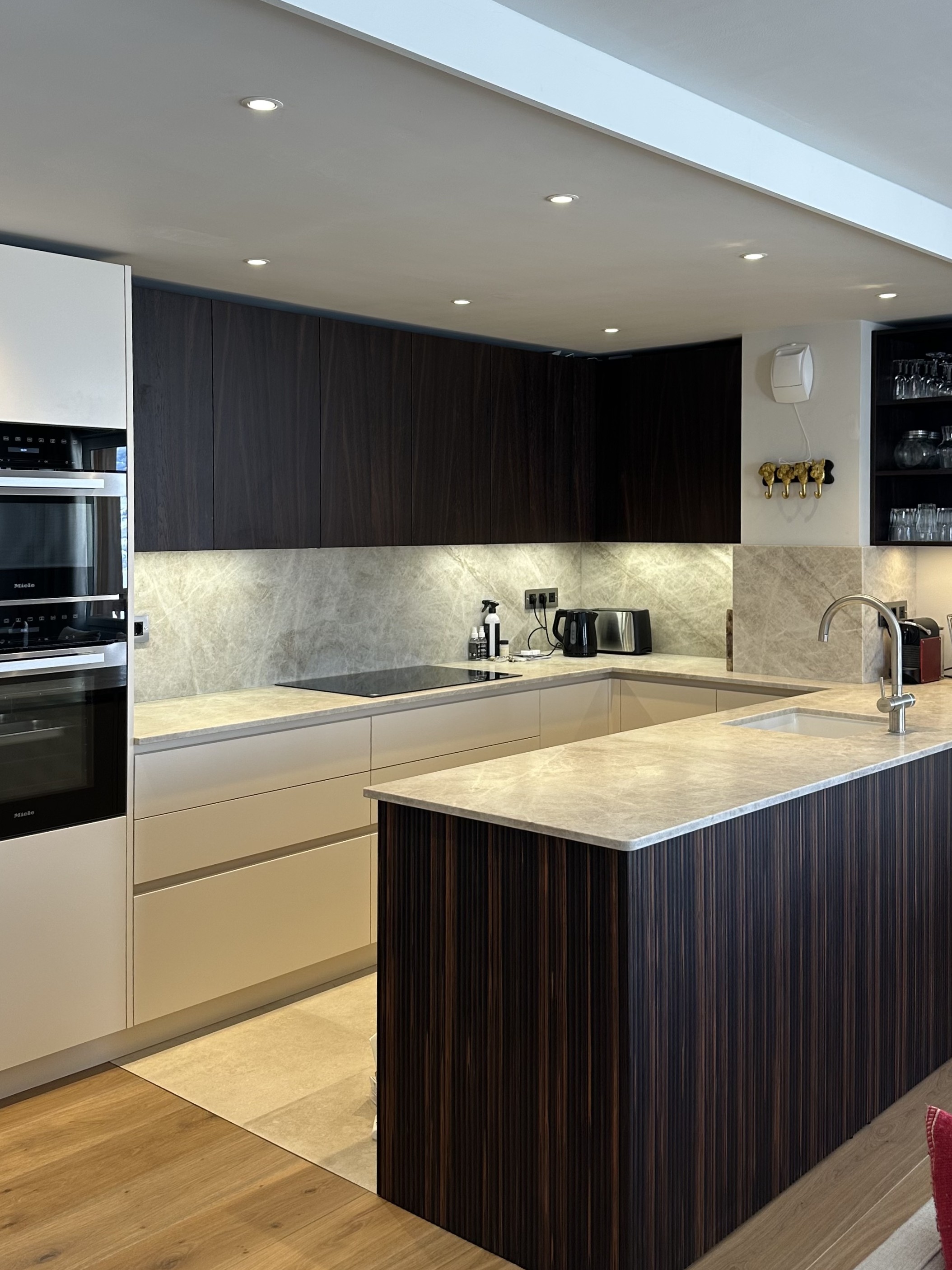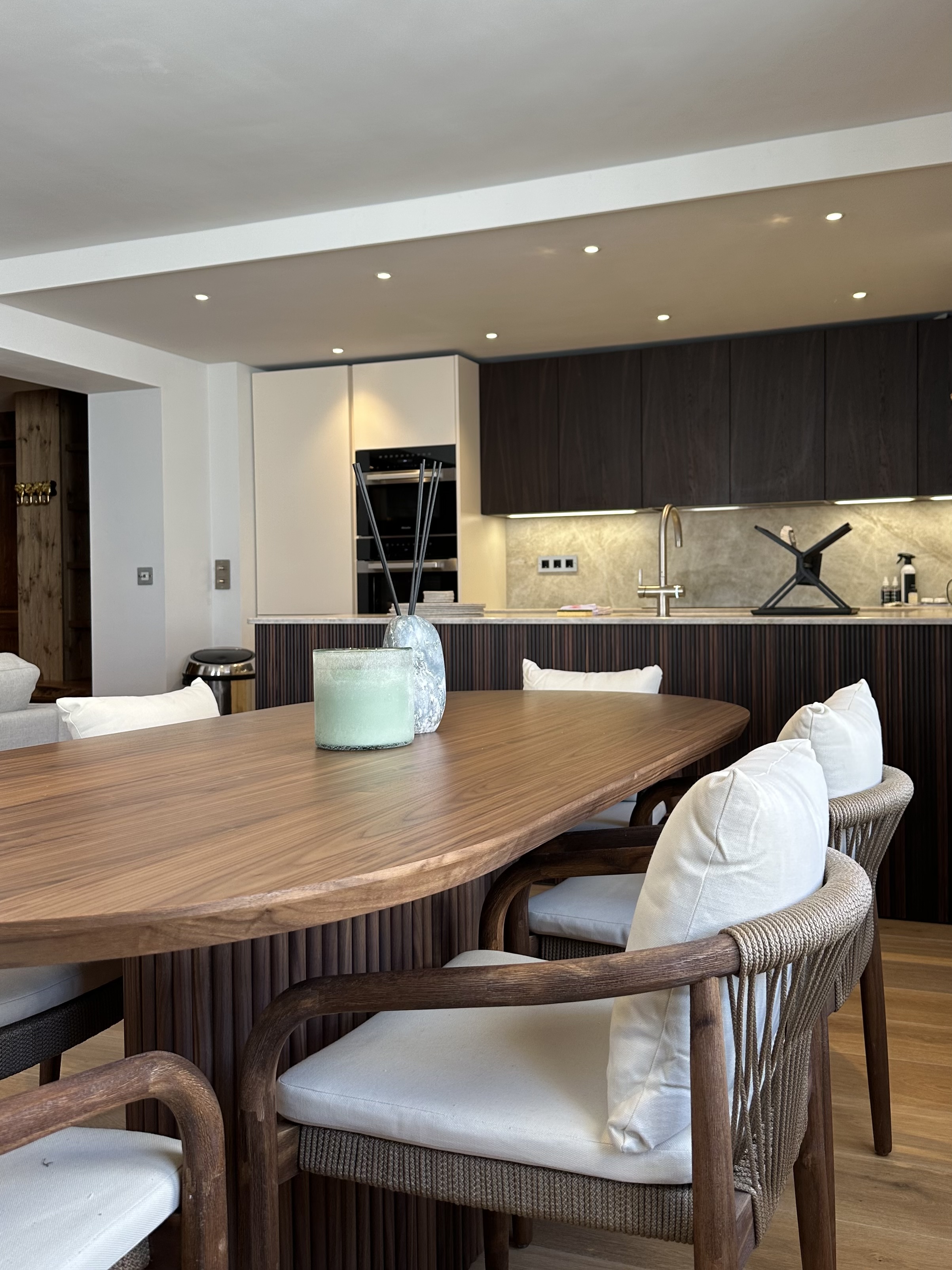 The kitchen has a large fridge with freezer drawers below, oven, microwave, kettle, Nespresso coffee machine, toaster, dishwasher, washing machine. The dining table sits in front of it with ample seating for up to 8 people.