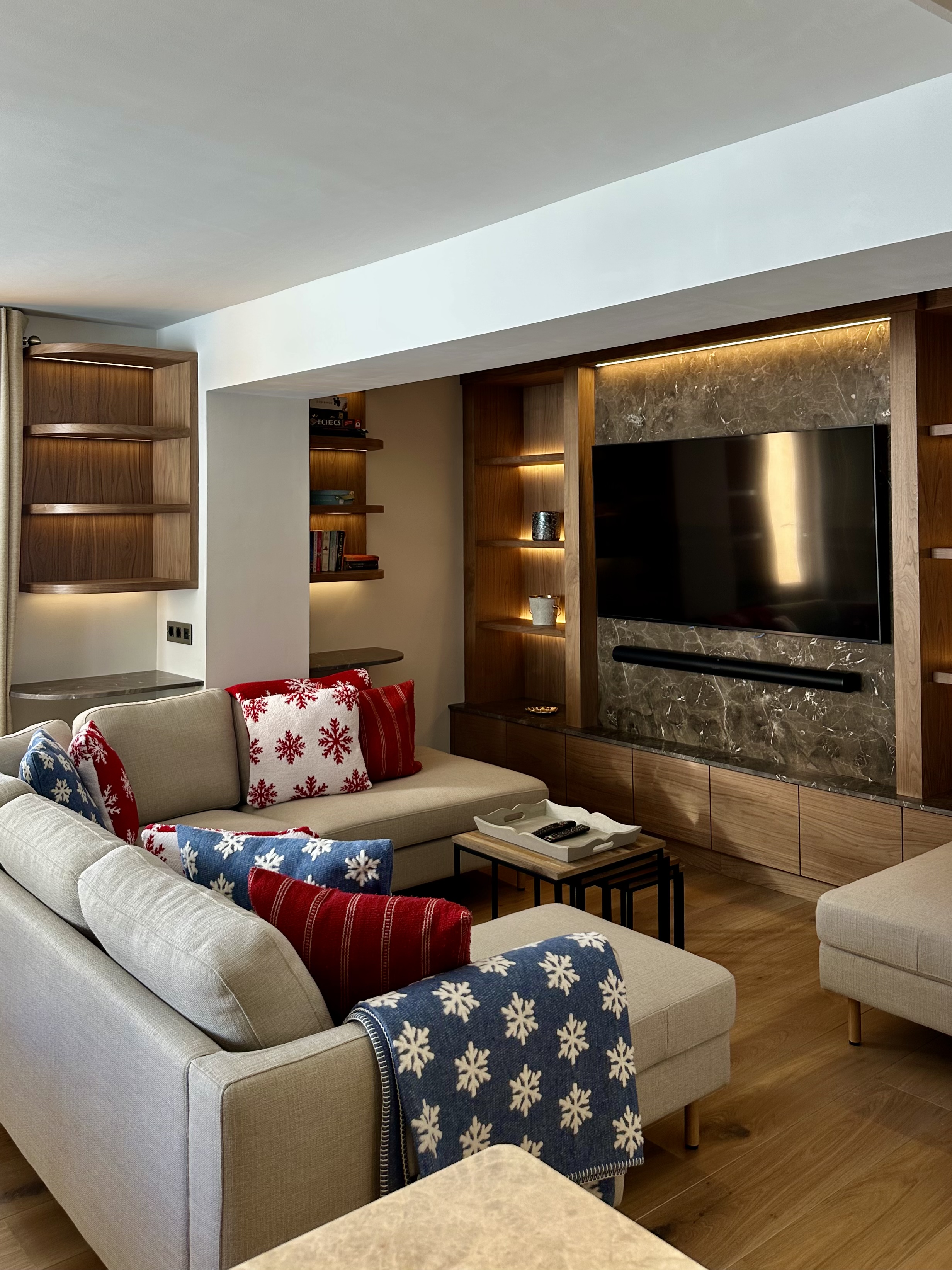 The living room is the other side of this room. It has 2 lounge chairs, coffee table and an L shaped sofa. Wall mounted TV and the property will have IPTV for next winter. It has an ADSL wifi connection.